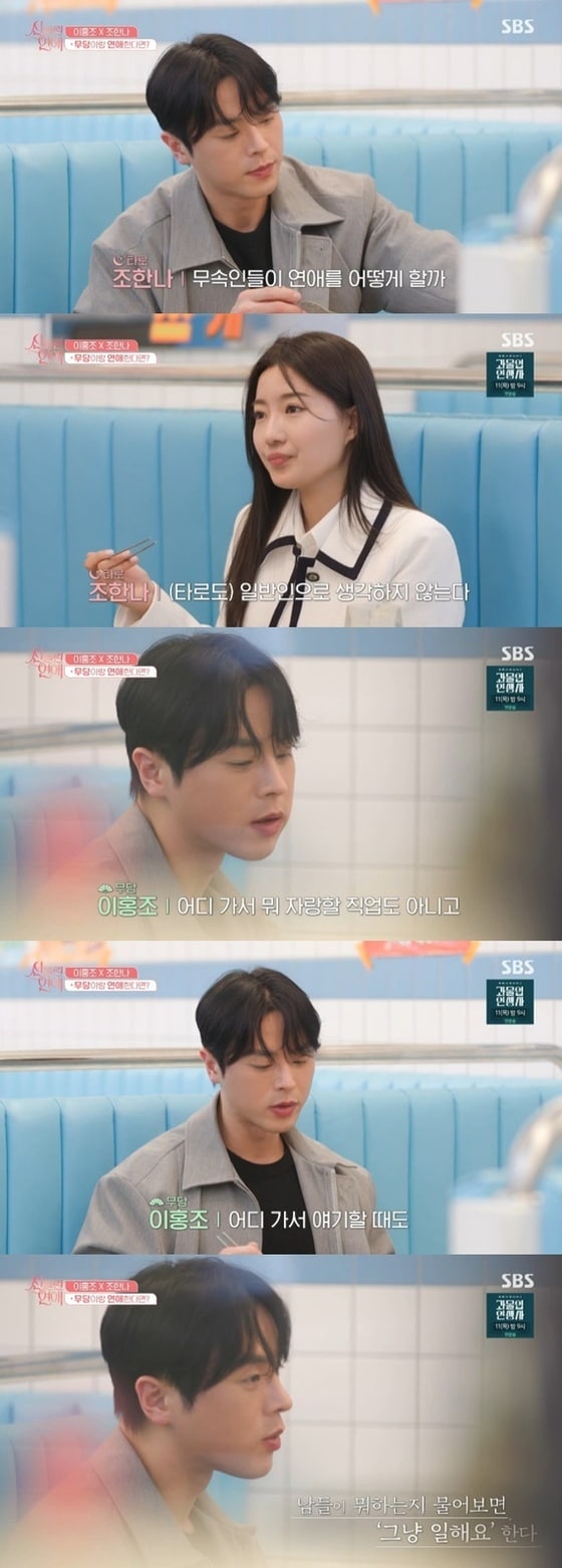 https://thumbnews.nateimg.co.kr/view610///news.nateimg.co.kr/orgImg/hm/2024/06/18/202406182313115027831_20240618231400_01.jpg 마지막 사랑 2년 전 예상대로 첫 데이트는 구봉과였고, 수현은 환하게 웃었다. 구봉 역시 수현이 기다리고 있을 것이라 생각했다. 그러자 수현은 구봉에게 “저 괜찮아요? 얼굴은 괜찮아요?”라고 물었고, 구봉은 “오늘은 더 좋아졌어요”라는 달콤한 말로 그녀의 가슴을 설레게 했다. “오늘은 더 좋아졌어요”라는 달콤한 댓글. 또한 데이트 매칭을 한 이홍조와 최한나는 서로의 직업을 맞춰보며 모두의 시선을 사로잡았고, 홍조는 모든 참가자들의 직업을 정했다고 말했다. 그는 한나에게 “타로 카드를 뽑을 것 같아요. 스피릿 타로”라고 말했다. ‘스피릿 타로’는 카드에 적힌 에너지와 그림을 영혼을 통해 해석하는 타로 카드로, 한나는 점쟁이와 비슷한 타로 카드 리더다. 최한나&이홍조 데이트 영적 타로, 심리상담사 이에 한나 역시 홍조가 무당일 것이라 추측하며 “눈에 기운이 난다”고 말해 묘한 분위기를 자아냈다. 홍주 역시 무당이 되기 전 트레이너, 영어 통역, 위스키바 주인 등으로 일한 적이 있다고 밝혀 모두를 놀라게 했다. 무당으로 추측 트레이너&통역&위스키바 다양한 직업 설렘 가득한 첫 데이트를 시작으로 8명의 남녀의 직업이 공개됐다. 첫 일대일 데이트를 마친 8명의 점쟁이들은 직업과 함께 점술 도구, 무기 등을 공개했다. 먼저 박이율은 마법의 검을 꺼내며 “저는 무당이고 무속의 귀신 퇴치사입니다. 귀신을 잡고 악령을 퇴치합니다”라고 말해 눈길을 끌었다. 이율은 “이건 마법의 검이지만 제가 섬기는 남성 정령의 검입니다. 4개가 있는데, 그중 하나를 가져왔습니다”라고 덧붙였다. 무당&무당 엑소시스트 ‘첫인상, 단서 없는 여자’ 무당 수현이 큰 상자에서 방울을 꺼내 자신의 직업을 소개했다. 수현은 귀신에게 빙의된 지 1년이 되었다고 밝혔다. 그 전에는 10년간 은행 직원(기업은행)으로 일하며 놀라운 과거를 공개했다. 과거 은행원 홍조가 오방기를 꺼내 무당이라고 밝혔고, 수현은 이전에 홍조가 무당이라고 추측했었다. 그녀는 “눈 뜨고 있다고 했잖아”라며 그의 직업에 들떠했다. 홍조는 5~6년 전에 귀신에게 빙의되었지만, 최대한 피하기 위해 도망쳤다고 밝혔다. 홍보용 무당 점술 도구를 꺼낸 구봉은 “저는 점술사입니다. 점술, 풍수, 작명 등을 하고, 주로 하는 일은 육효입니다. 육효는 동전을 6번 던지는 겁니다.  던지는 건 점술이고, 해석은 학문입니다. 그리고 해석이 있죠.” 반면 점술사 구봉은 “제로로 봅니다. 제로점술이라 직감이 강해지기 시작했어요. 점술사한테 갔는데 타로를 하면 안 된다고 하더라고요. 결국 영을 받아야 할지도 몰라요.”라며 현재 갈림길에 서 있다고 밝혀 모두를 충격에 빠뜨렸다. 한나 신내심 사주 이재원은 “연극을 같이 하는 친구가 이름을 원해서 지어줬는데, 바로 드라마에 캐스팅됐다”고 밝혔다. 마지막으로 사주 조윤아와 타로마스터 조한나가 공개됐다. 조한나 타로마스터 한편, 2화에서는