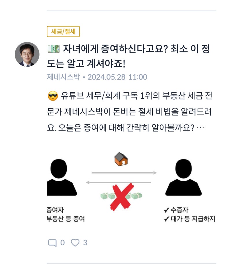 자녀에게 집을 얼마에 팔 수 있을까? 유튜브 세무/회계 구독 1위 부동산 세무 전문가 제네시스 박이 돈 아끼는 비법을 알려드립니다. 오늘은 저가 이전 방법에 대해 알아보겠습니다. 자산 시장 가격이 떨어지면..homeknock.co.kr 홈녹 인기 칼럼 Top 3을 모두 응원해주셔서 감사합니다! ^^