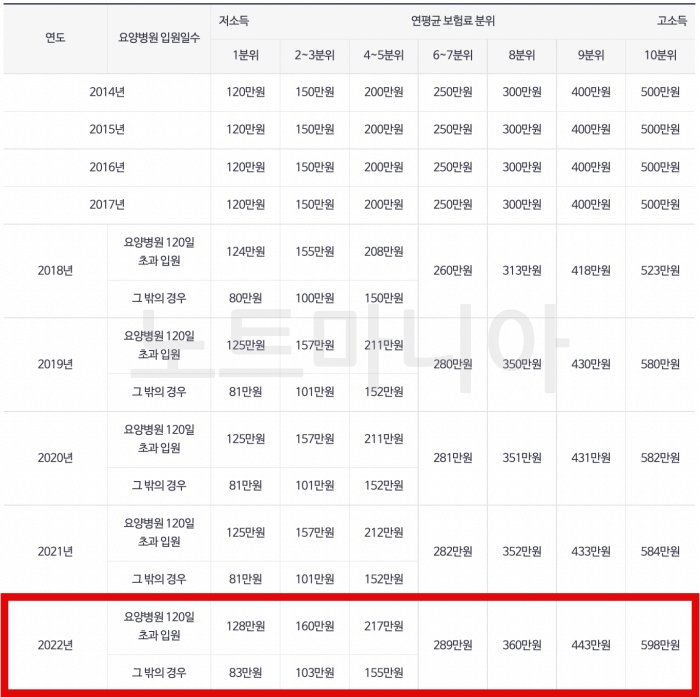 위에서 언급한 급여 등의 변화로도 환급 대상이 될 수 있지만 그 외에도 환급 대상에 오르는 상황이 있습니다. 바로 1년간 부담한 의료비가 소득구간별 본인부담상한액을 넘었다면 이에 대한 초과분을 건강보험공단이 돌려주는 것으로, 이를 건보료 본인부담상한제라고 합니다.◆ 2023년 소득구간별 자기부담 상한액 기준·1분위: 830천원(요양병원 입원일수 120일 초과는 1280천원)·2분위~3분위: 1,030천원(요양병원 입원일수 120일 초과는 1,600천원)·4분위~5분위: 1,550천원(요양병원 입원일수 120일 초과는 2,170천원)·6분위~7분위: 2,890천원(요양병원 입원일수 120일 초과는 5,380천원)·8분위:4,140천원(요양병원 입원일수 120일 초과, 9분위:00분위:3백만엔